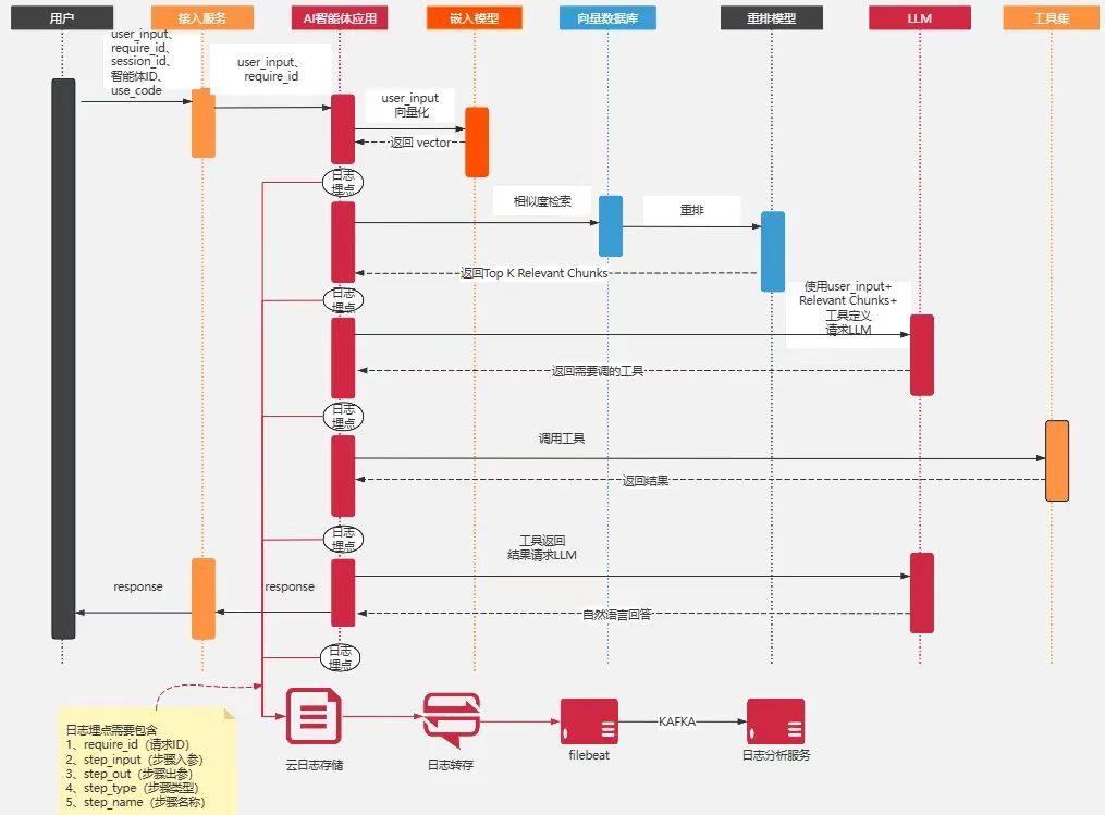 生成的答案,通过智能体应用层返回给接入服务,由接入服务再返回给用户。同时,系统也会将这次请求的全部日志——从接入、向量化、检索、重排、调用工具、LLM生成——全部写入日志链路,包括: