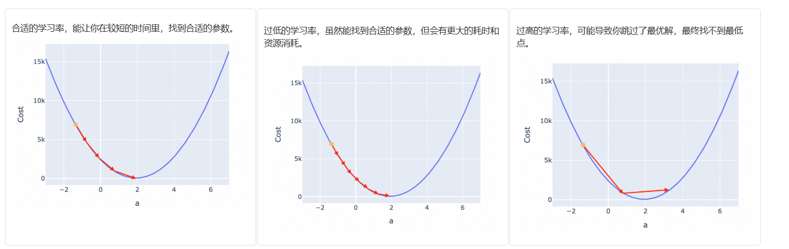 有了 Cost Function,寻找模型合适的参数的任务,就可以等效为寻找 Cost Function 最小值(即最优解)的任务。找到 Cost Function 的最小值,意味着该位置的参数 a 取值,就是最合适的模型参数取值。